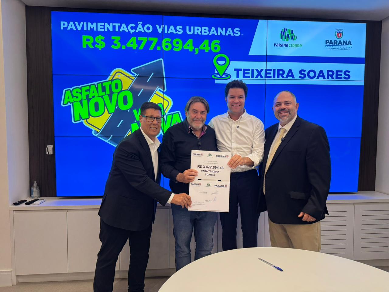 O município de Teixeira Soares acaba de garantir mais R$ 3,4 milhões para pavimentar ruas que ainda não possuem asfalto. O anúncio foi feito nesta segunda-feira (06), na Secretaria de Estado das Cidades, pelo secretário Guto Silva, pelos deputados estaduais Artagão Júnior e Adão Litro, e pelo prefeito Ivanor Muller.
