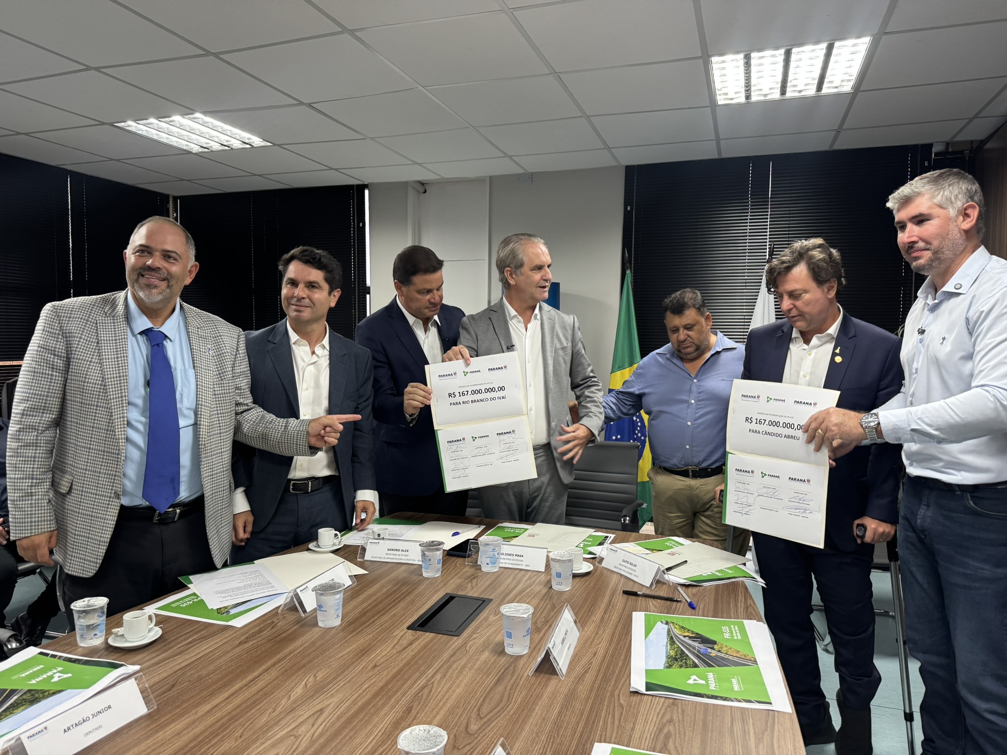 O ato contou com a presença do presidente da Assembleia Legislativa do Paraná, deputado Alexandre Curi; do secretário de Estado da Infraestrutura e Logística, Sandro Alex; do secretário de Estado das Cidades, Guto Silva; do secretário de Estado do Planejamento, Ulisses Maia; do presidente da Paraná Projetos, Eduardo Magalhães; além dos prefeitos Renan Romanichen, de Cândido de Abreu, e Pedro Taborda, de Rio Branco do Ivaí, bem como deputados estaduais.