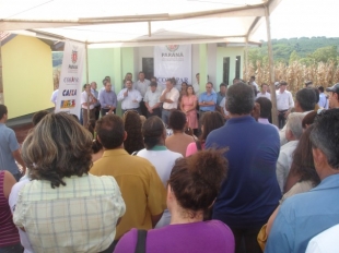 A população vê o deputado discursando após a entregue das 23 casas populares